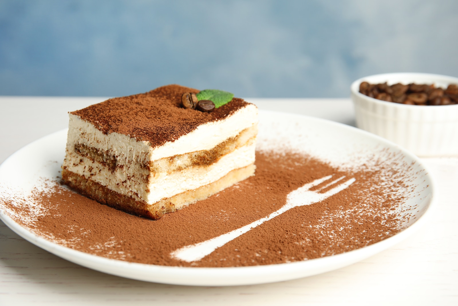 An Italian Delicate Coffee Sponge with Chocolate Sauce, Cream and Sprinkled with Chocolate Flakes