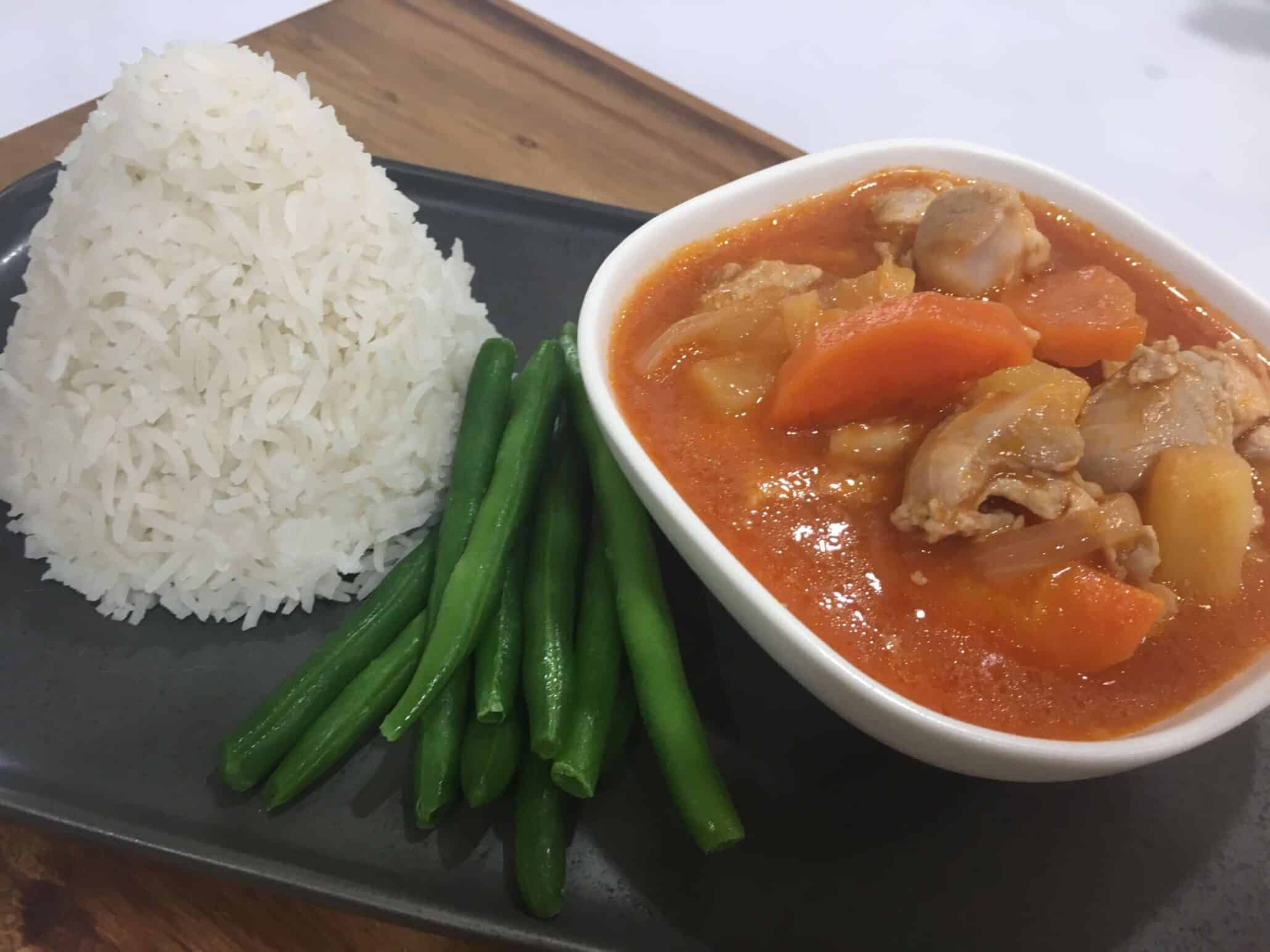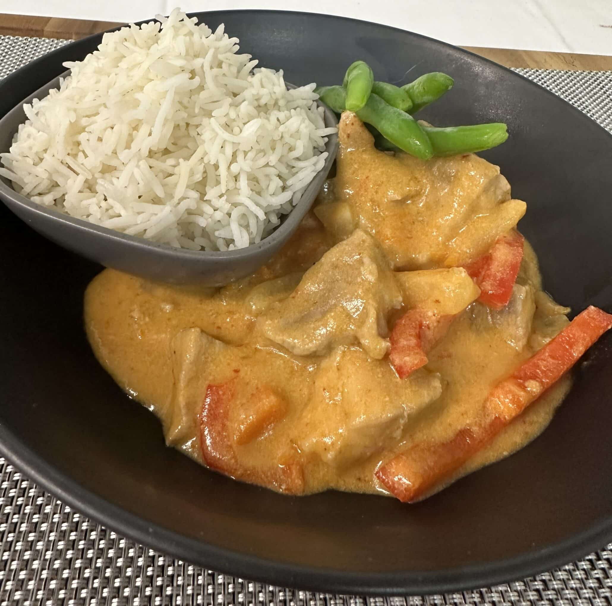 Tender Pork Pieces cooked with Pineapple, Carrots and Capsicums in a delicious Coconut Cream Thai Red Curry Sauce, served with Rice and Green Beans