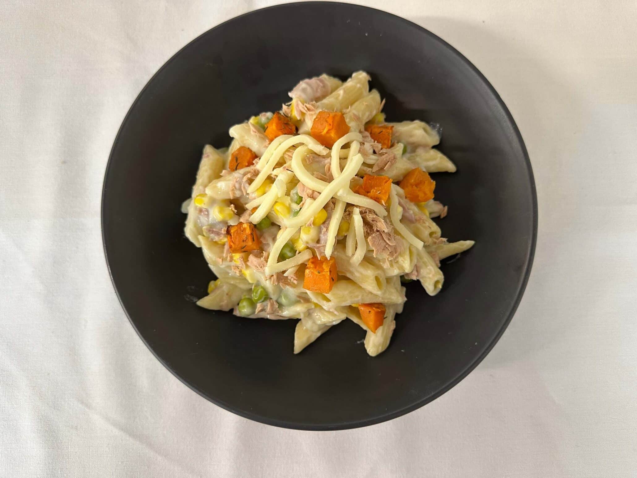 Penne Pasta and Tuna tossed with Sweet Potato, Peas and Sweetcorn through a Creamy Morney Sauce, finished with Cheese